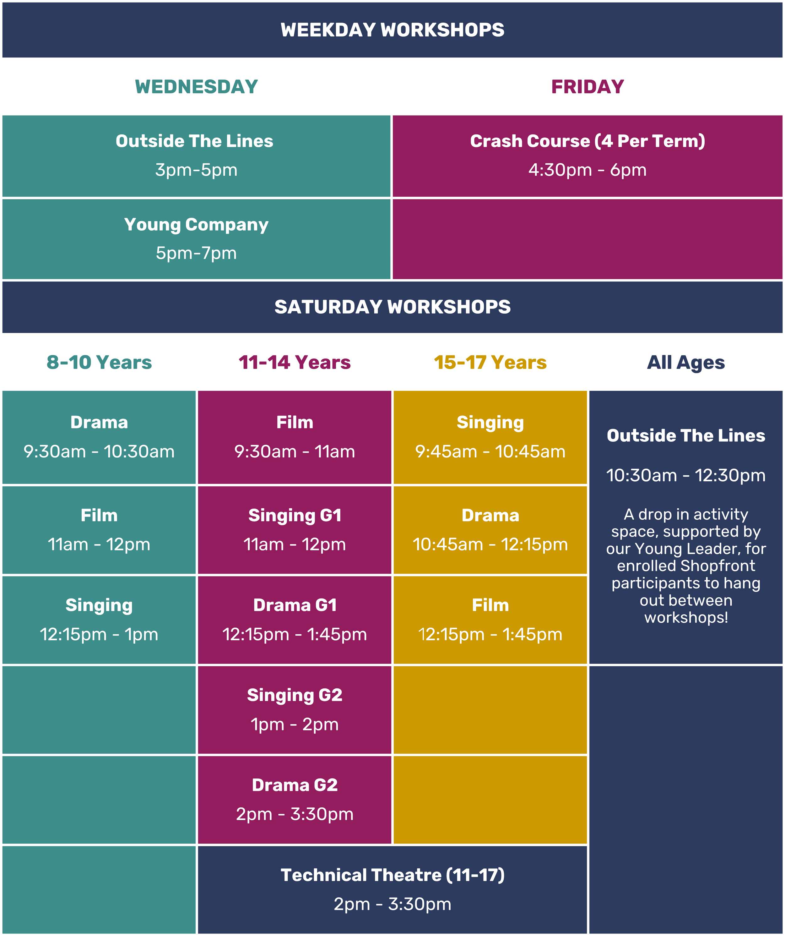 Workshops are offered to age groups 8-10, 11-14 and 15-17.